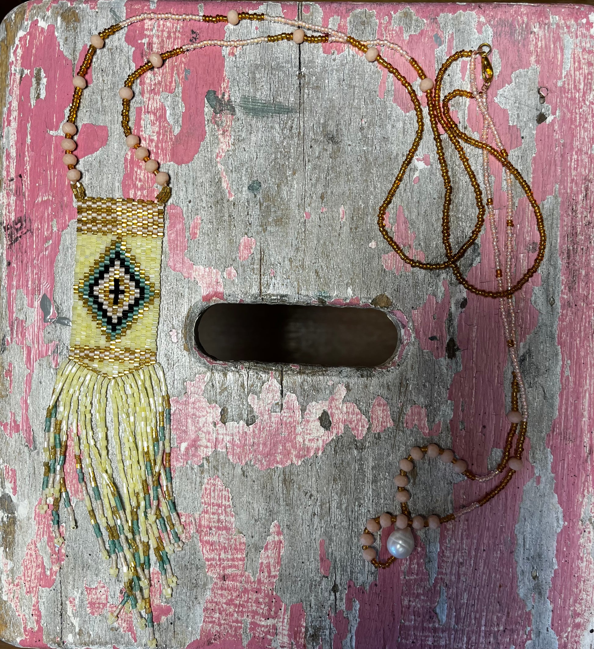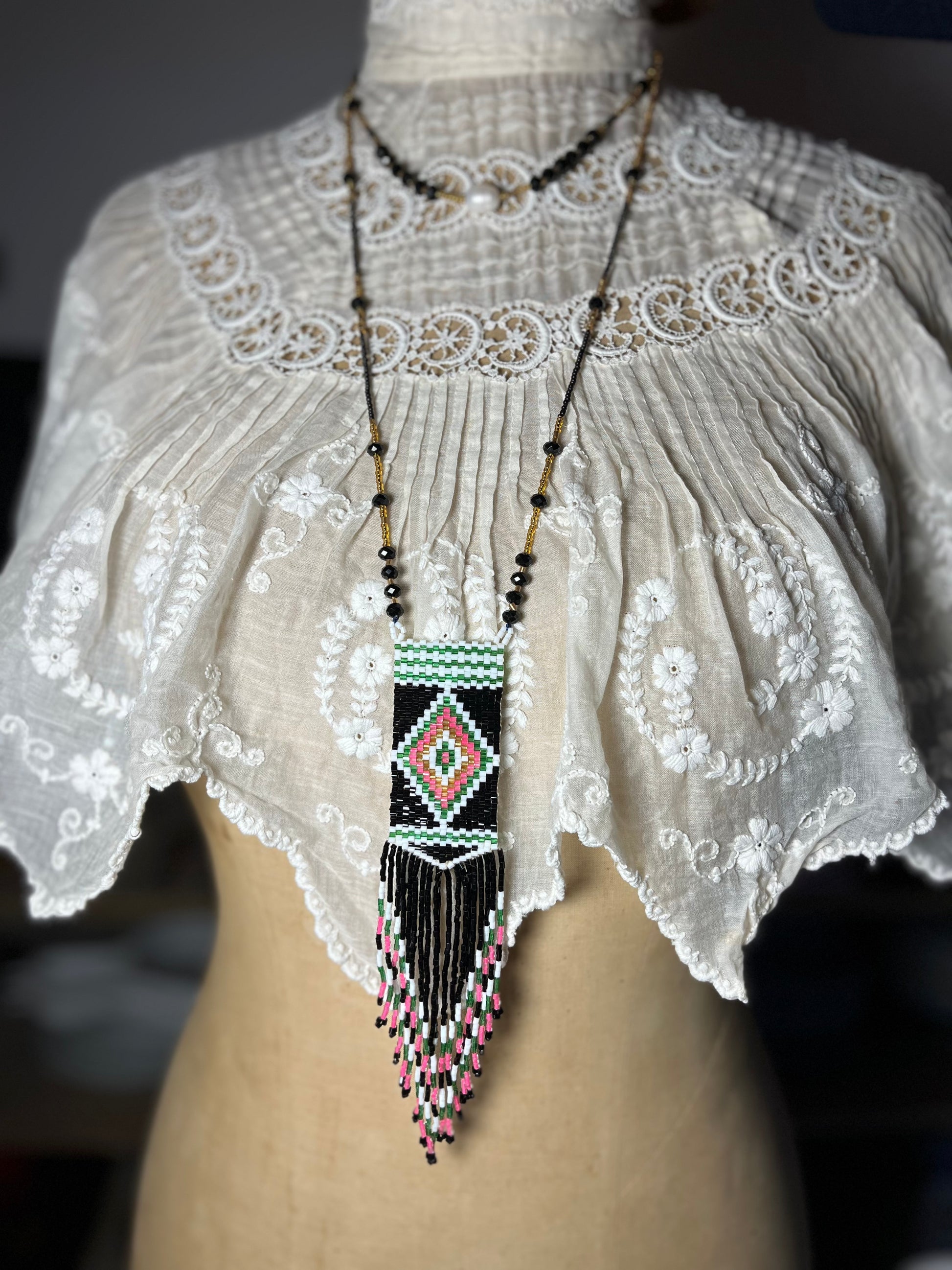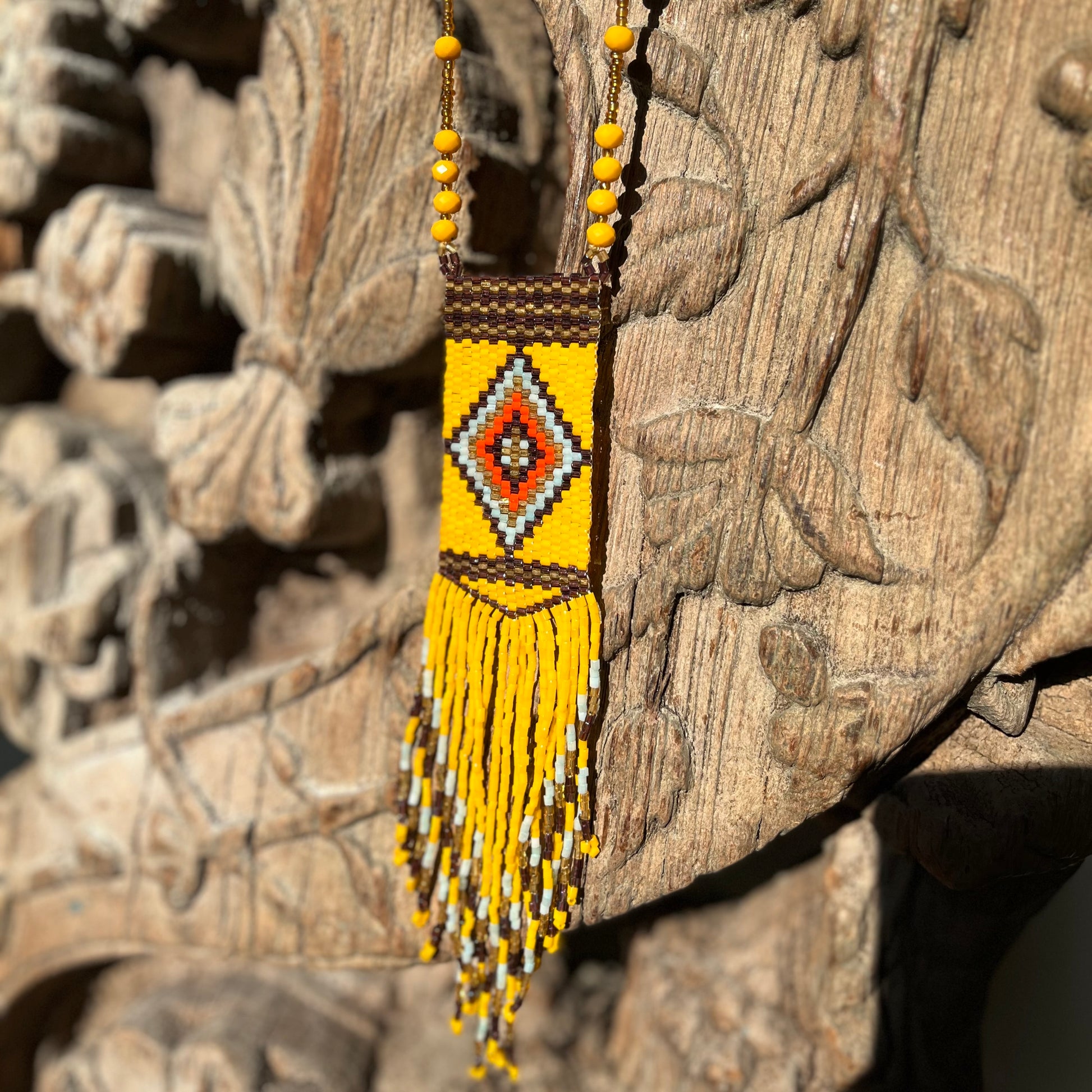 Ajoutez une touche d’exotisme et de vivacité à votre look avec ce magnifique sautoir indien en perles de verre tissées à la main. Le pendentif central, inspiré des motifs tribaux, mêle des teintes éclatantes de jaune et de violet pour un résultat saisissant. Les franges délicates prolongent ce design captivant, offrant une sensation de mouvement et de légèreté. Les chaînes en perles dorées et jaunes ajoutent une dimension raffinée, parfaite pour un style bohème chic.