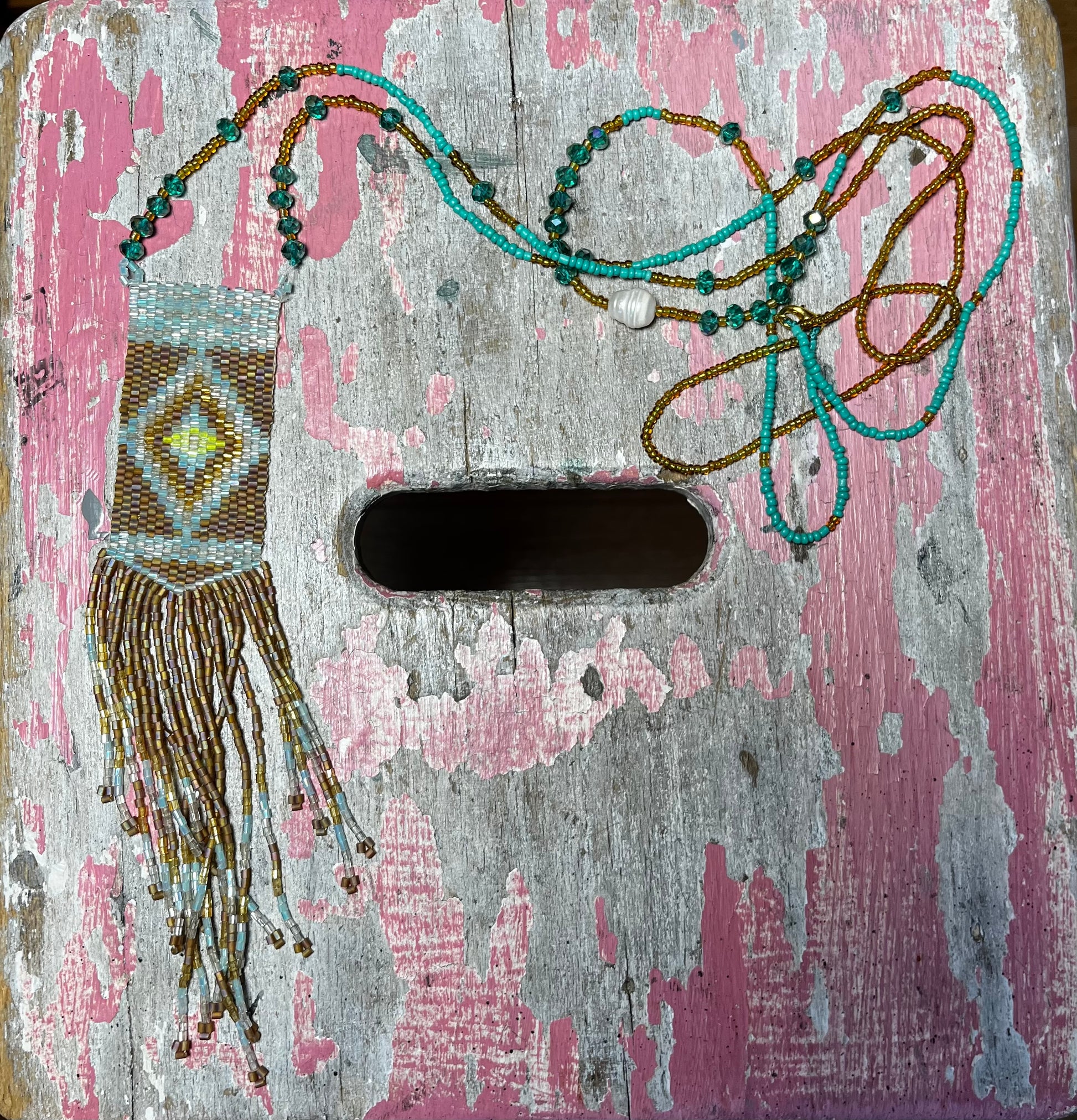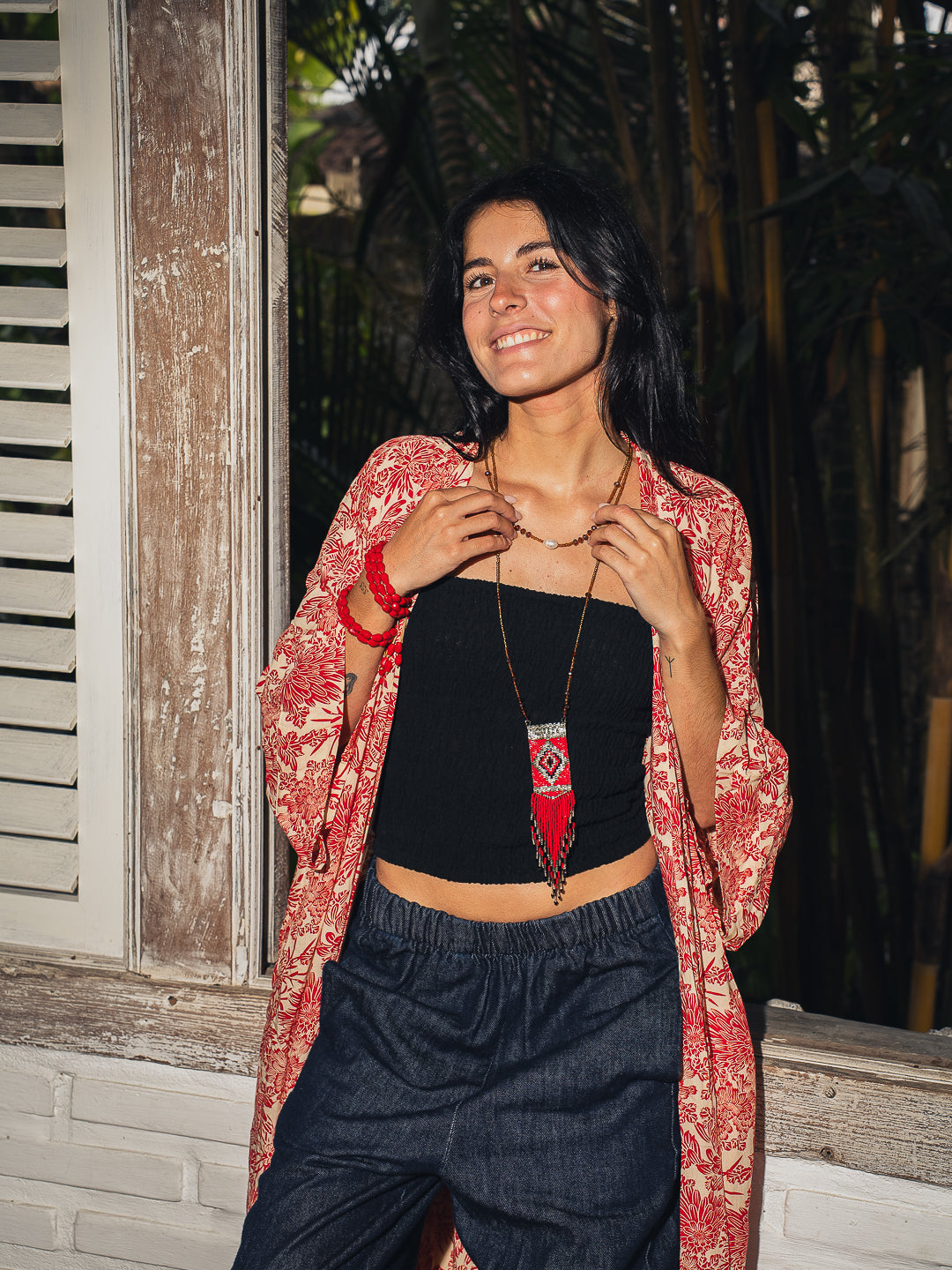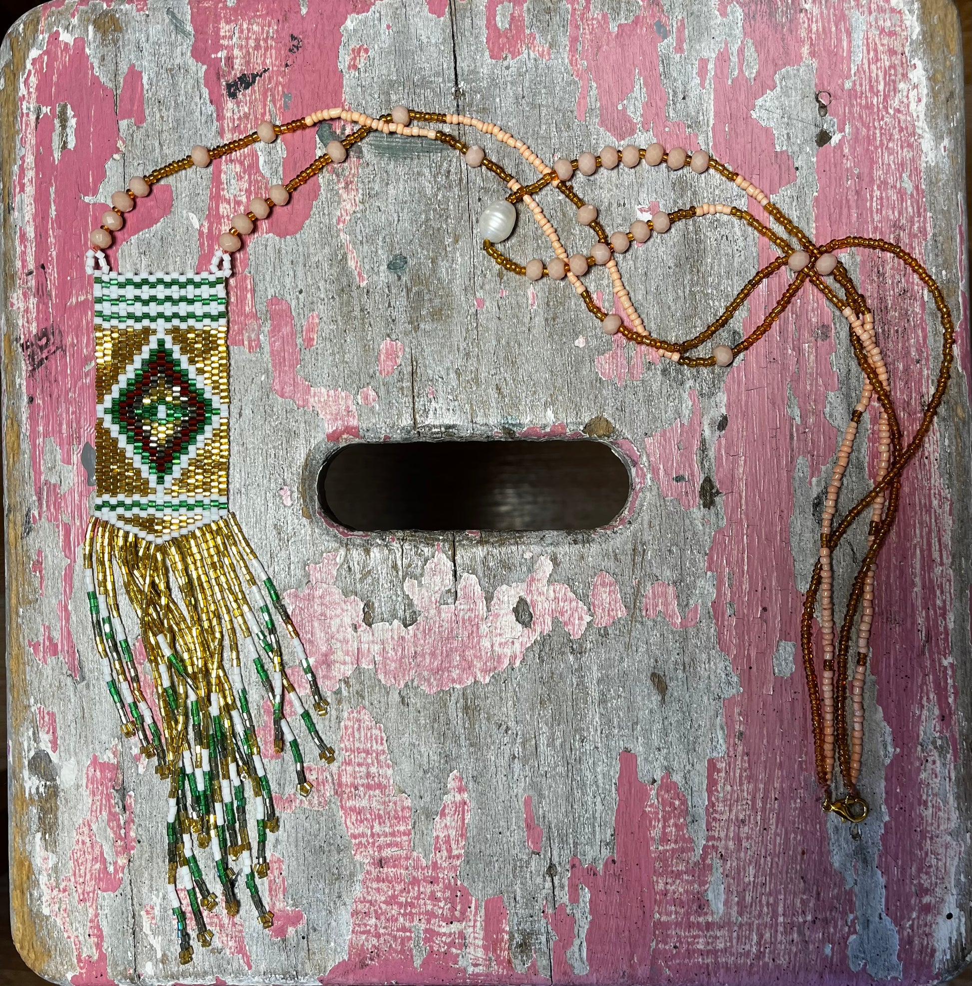 Ajoutez une touche d’exotisme et de vivacité à votre look avec ce magnifique sautoir indien en perles de verre tissées à la main. Le pendentif central, inspiré des motifs tribaux, mêle des teintes éclatantes de jaune et de violet pour un résultat saisissant. Les franges délicates prolongent ce design captivant, offrant une sensation de mouvement et de légèreté. Les chaînes en perles dorées et jaunes ajoutent une dimension raffinée, parfaite pour un style bohème chic.