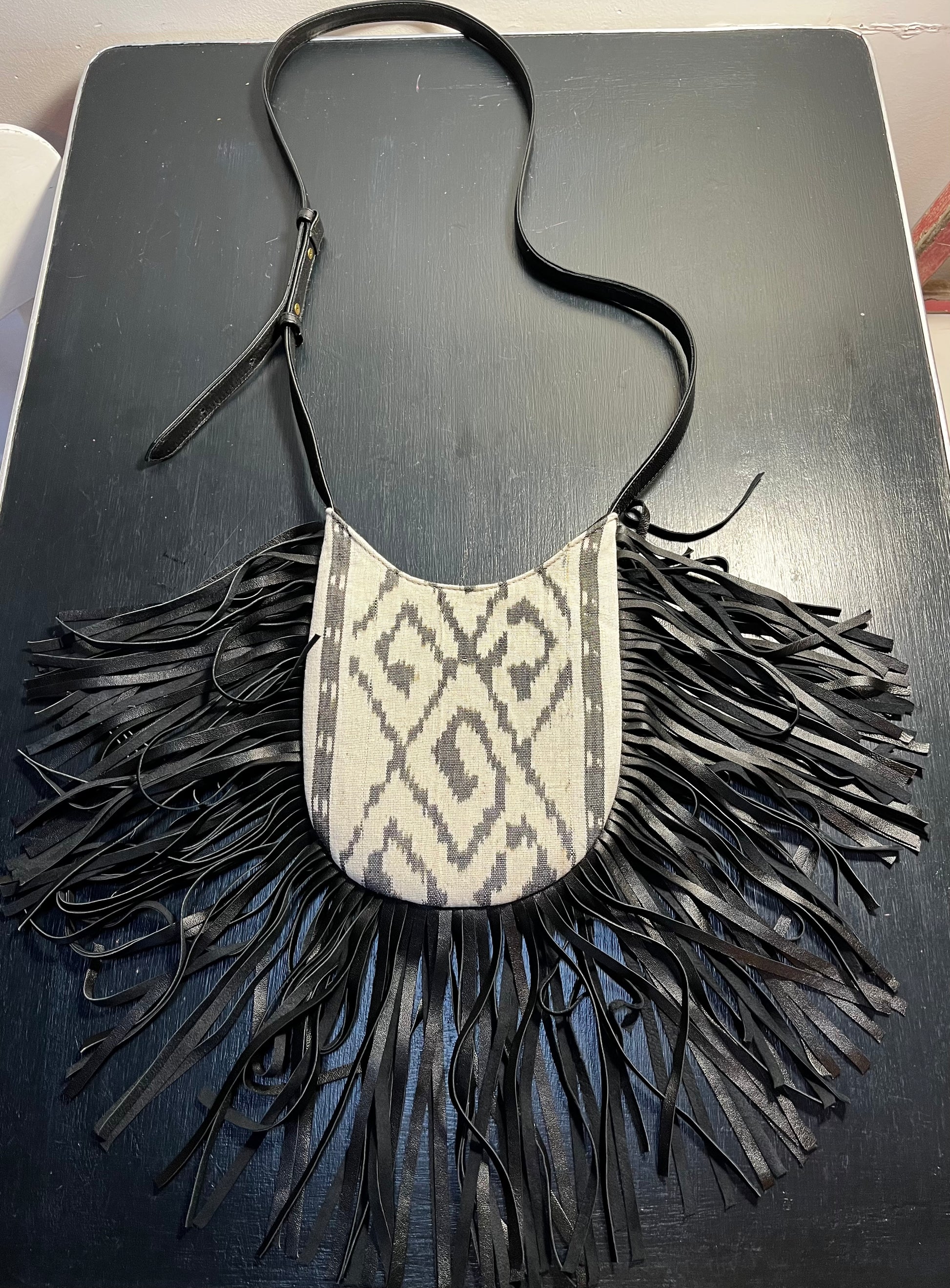 Élégant et audacieux, ce sac bandoulière associe le savoir-faire artisanal au design bohème-chic. Réalisé à partir d’un somptueux tissu ikat tissé à la main, il est sublimé par des franges en cuir souple dans un rouge vibrant, apportant une touche de mouvement et de caractère.
