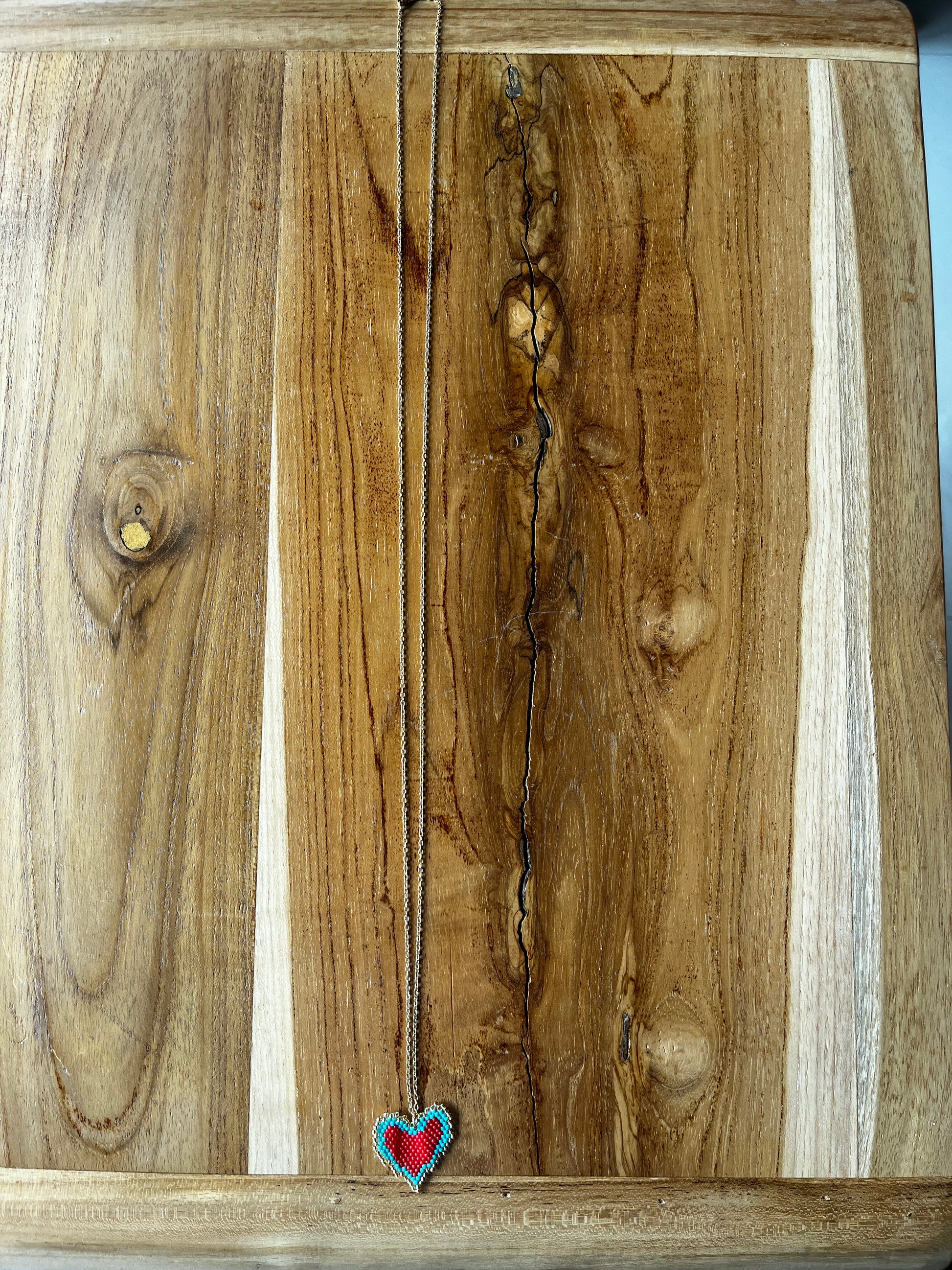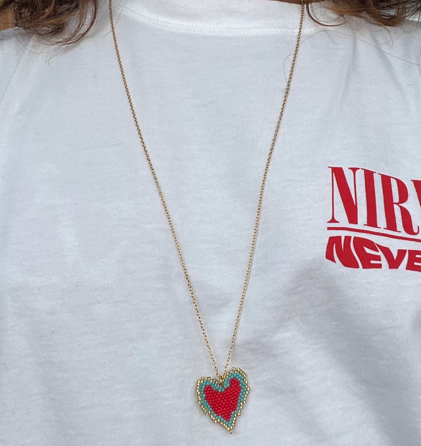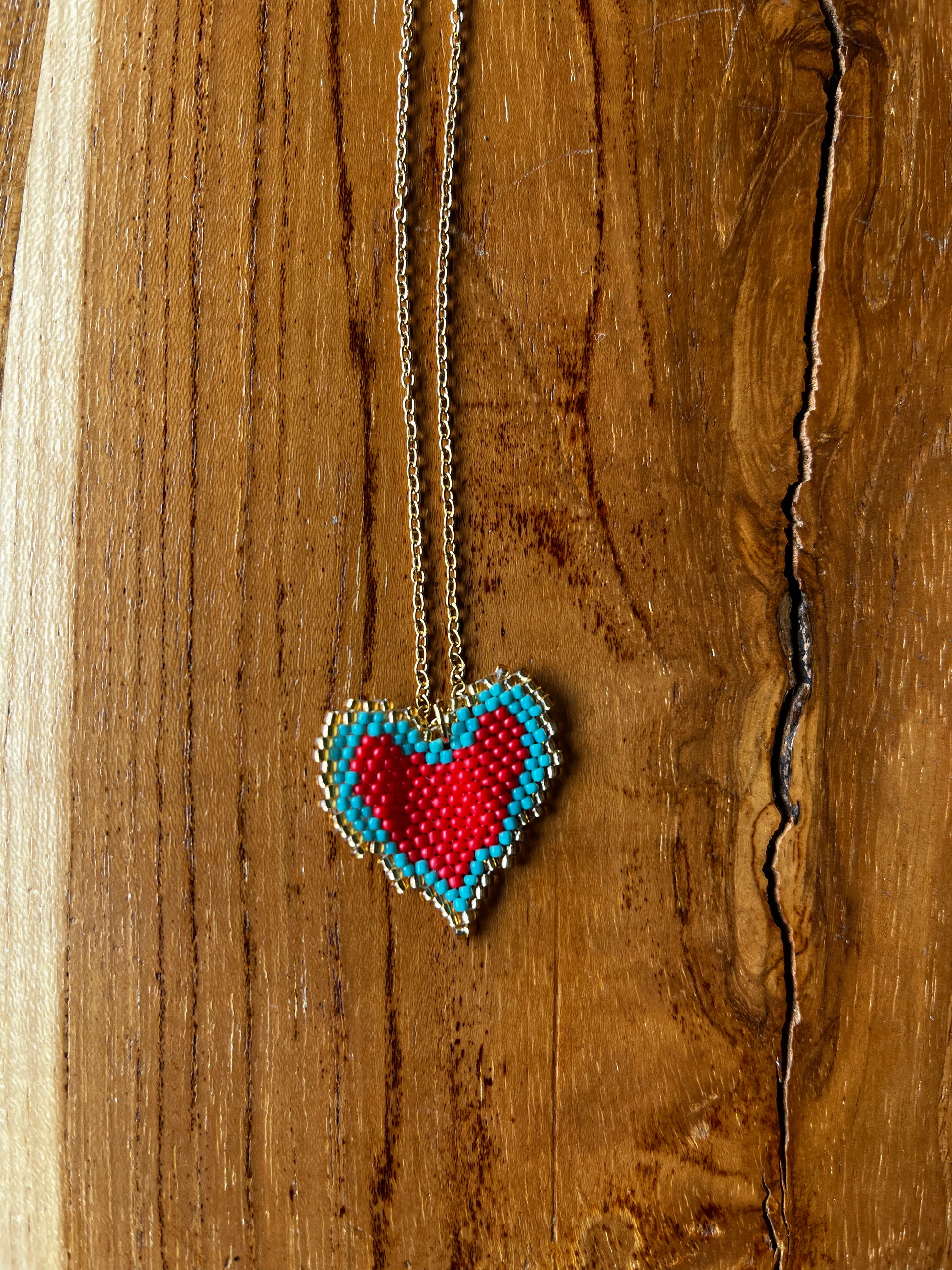 Pendentif coeur en perles rouges bleues et dorés monté sur une longue chaine doré