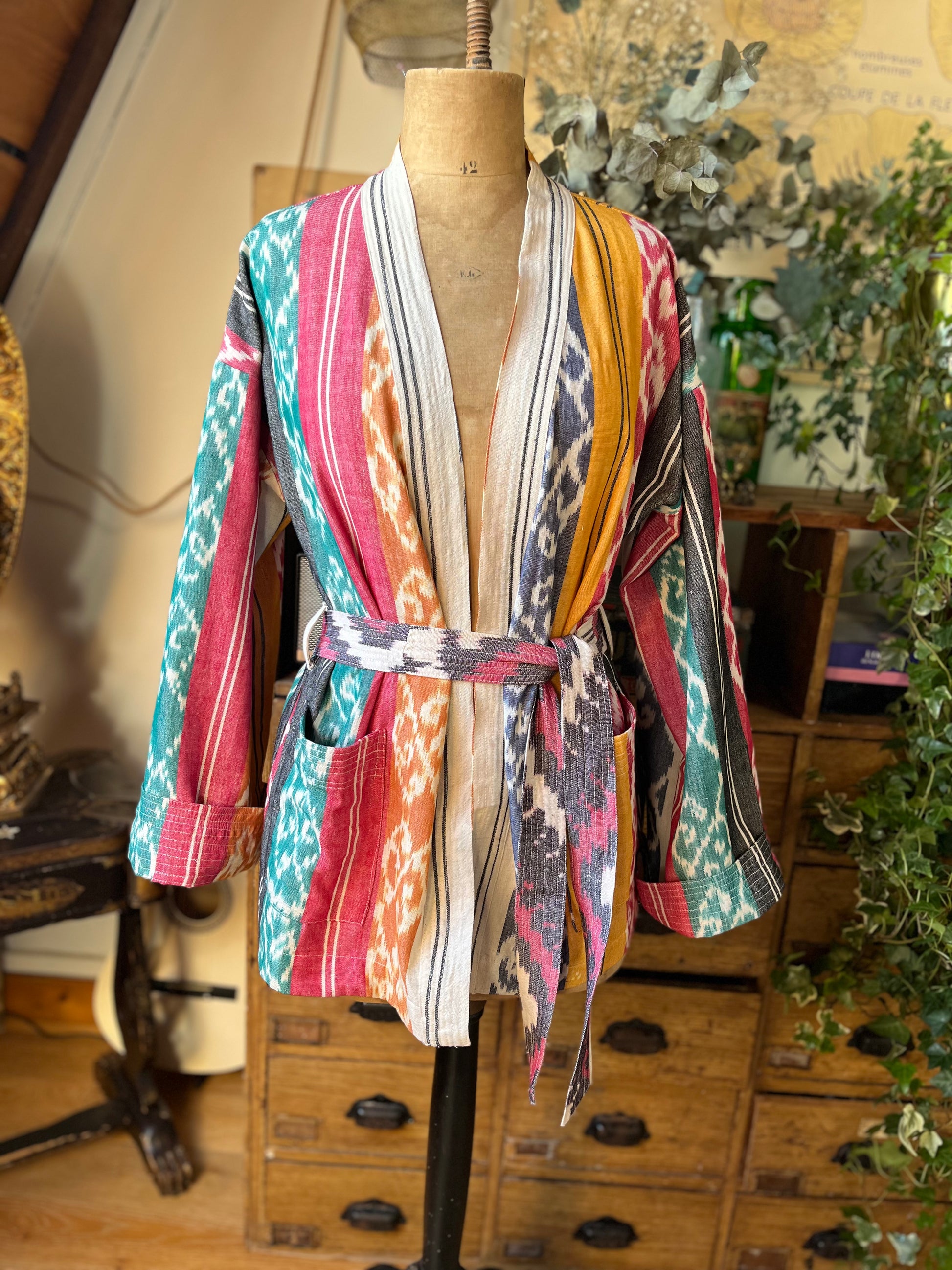 Ainsi, une veste ikat est simplement une veste réalisée à partir de ce type de tissu, souvent utilisé dans des vêtements traditionnels ou modernes pour ajouter une touche d'originalité et d'artisanat. Les vestes en ikat peuvent varier en termes de style, de coupe et de couleurs, mais elles sont généralement prisées pour leur texture et leur aspect unique.